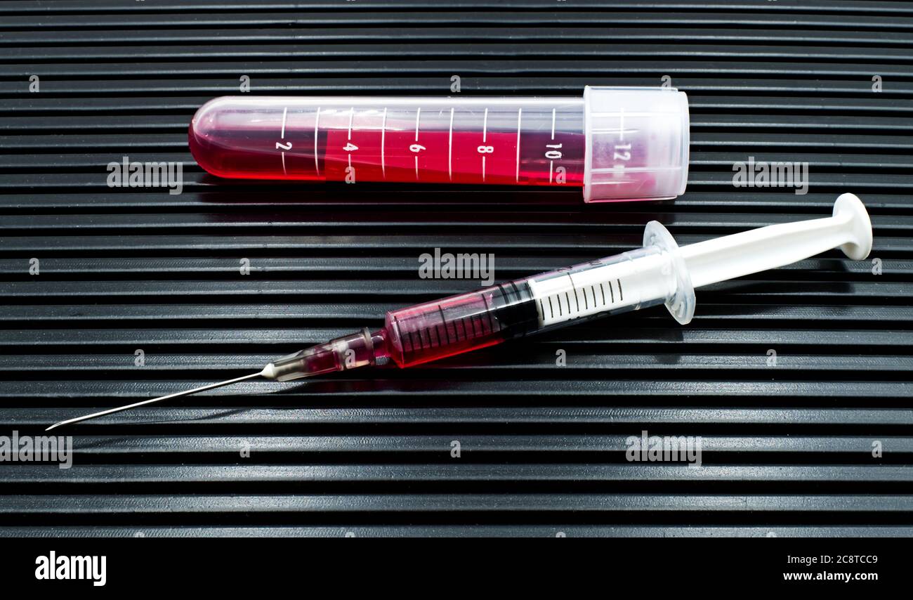Blood Sample And Syringe Injection Isolated On Dark Background Stock Photo Alamy
